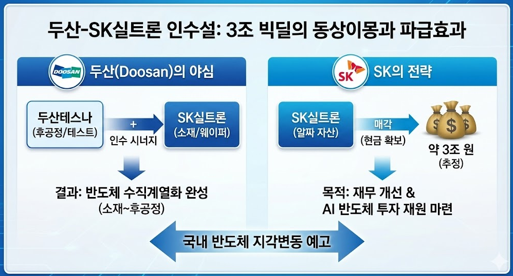 - 🏗️ 두산의 꿈: 이미 인수한 두산테스나(후공정)에 이어 소재(웨이퍼)까지 확보하여 완벽한 반도체 그룹으로 변신하려는 야심.
