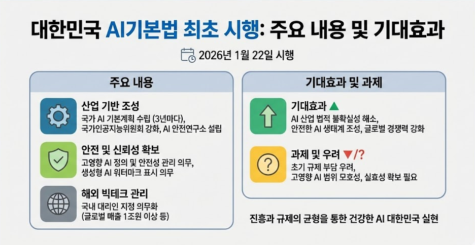 - 인공지능 발전과 신뢰 기반 조성 등에 관한 기본법(AI 기본법)이 22일부터 세계 최초의 포괄적 법령으로 시행됐습니다.