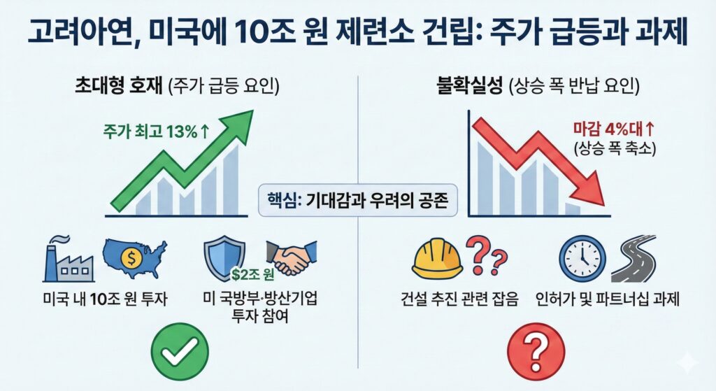 2. 똑똑한 돈 굴리기 (JV 효과) 10조 원이라는 돈은 엄청나게 큰 액수입니다. 만약 고려아연 혼자 다 부담했다면 “회사가 무리하는 것 아니냐”는 우려가 나왔을 겁니다. 하지만 현지에서 자금을 조달하고 미국 정부의 지원까지 받는 구조를 짰기 때문에, 회사의 재무 부담은 줄이면서 실속은 챙기는 영리한 결정으로 평가받았습니다.