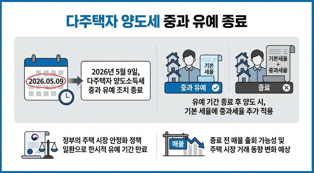 - 정부가 다주택자에 대한 양도소득세 중과 유예 조치를 오는 5월 9일부로 종료하기로 최종 결정했습니다.