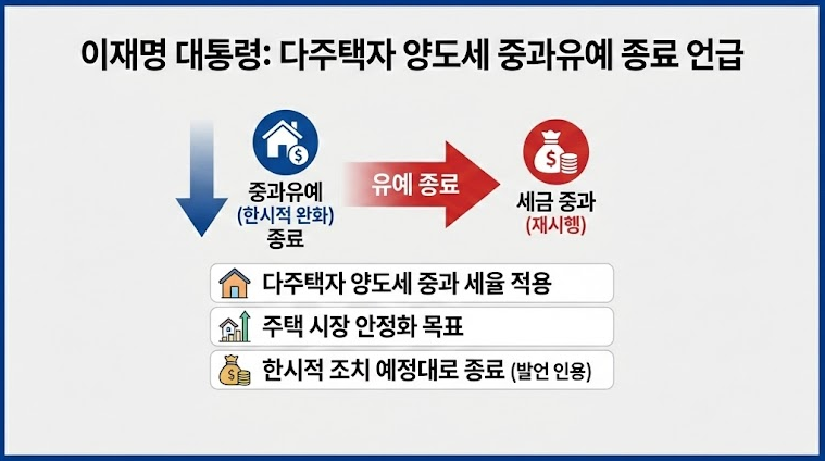 25일 이재명 대통령은 다주택자 양도세 중과 유예 조치에 대해 “재연장을 하도록 법을 또 개정할 것이라고 생각한다면 오산”이라고 밝혔습니다. 지난 정부 때 도입되어 최대 30%p의 세금을 깎아주던 이 혜택이, 이제는 역사 속으로 사라질 것임을 공식화한 것입니다.